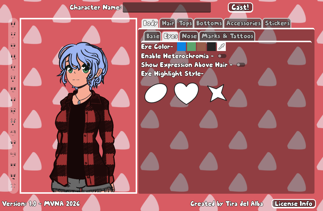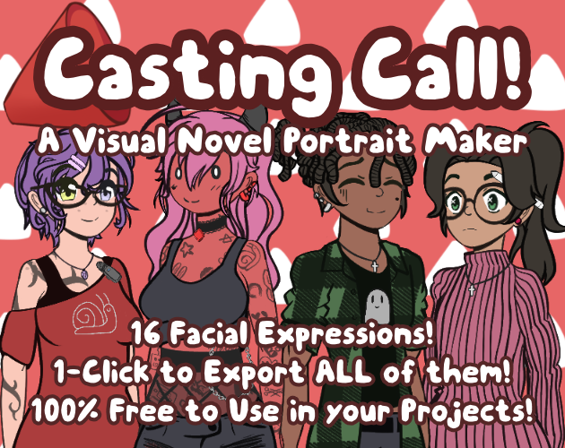 Casting Call! is a free Visual Novel Portrait Maker created in Godot and made in less than two weeks for the 2026 Make Visual Novel Assets (MVNA) game jam.